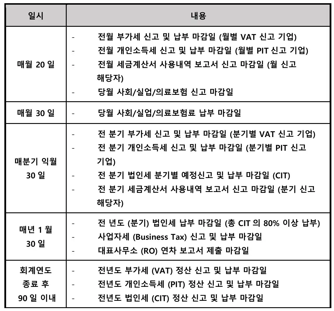 금번에는 베트남에서 기업 및 개인이 반드시 알아야 할 연간 세무 일정을 정리해 보겠습니다.